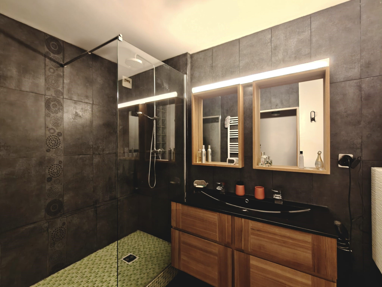 Coin nuit avec 3 chambres, salle de bain avec douche, wc et dressing.