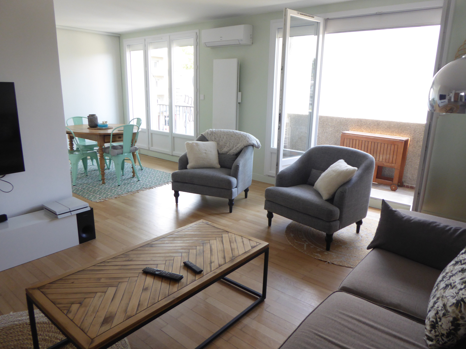 D'une surface de 80m² environ, il dispose d'une cuisine équipée moderne claire donnant sur une loggia fermée qui peut faire office de buanderie, d'un séjour double avec un parquet en excellent état et un balcon, une climatsation, 2 grandes chambres avec placards et dressing pour l'une d'entre elles. Une salle de bain avec douche à l'italienne, et des wc séparés.